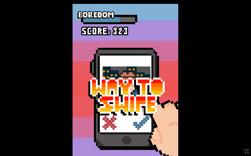 Millennial Swipe Sim 2015 by Buzzfeed creative director and game designer Will Herring captures the sea of nothingness that is Tinder’s unhacked gaemplay. The goal is to swipe as many times as possible (regardless of direction) and stave off boredom. The hollow, empty faces in each profile literally fuel your entertainment, as the game rewards you for callous indifference. The more time that passes, the less distinguishable the pixelated face become, quickly transforming from human into a nondescript horde of horny zombies. In a weird, twisted way, you begin to see this world as almost an execution of true communism, where everyone can rest assured that their exactly as useless and inconsequential as the last person you swiped left or right to get rid of.
