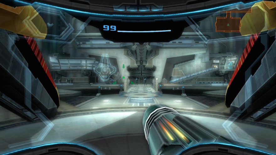 Of all the Prime games, Corruption is the only one that has you interacting directly with other humanoids who aren’t trying to kill you—at least not without speaking to you first. The game begins with Samus Aran essentially clocking in for the day, learning the ins-and-outs of first person action door-lock management as she strides up to the boss’s office. There she meets her rag-tag bounty hunting crew, each of whom are not particularly nuanced persons but are given distinct enough character notes to indicate that galaxies are large and often contain actual ongoing civilizations. In most previous Metroid games, Samus is late to the party and catches only the dregs of whatever massive catastrophe went down. But here, after a few trust falls with the gang, she’s at the forefront of an actual attack. Alongside the new bounty hunters she is given the chance to do some actual rescuing of a few space marines rather than simply picking through the corpses left behind. We finally get a glimpse of the living people Samus has been trying to protect.