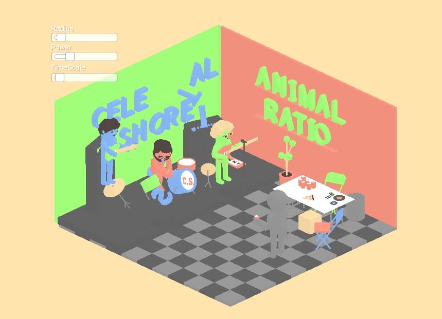 This is an interactive music video for the song Animal Ratio by Celestial Shore. Using your mouse, you can emit pulses of an invisible force inside the space where the band jams out their jumpy, alternative rock.