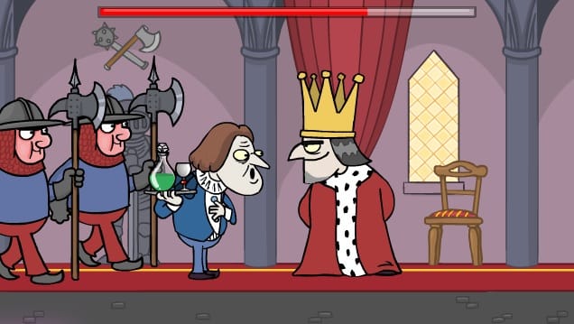 Sneaking up behind the king, your tip-toed steps matching the tempo of the music, you hold in the Spacebar to raise a poison-tipped snaky-bladed dagger above your head. The king will occasionally sniff or look up to the ceiling, telegraphing when he is about to look around, and if he catches you poised for murder, it’s your head.