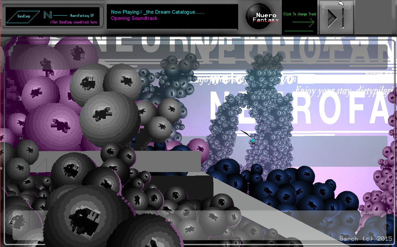 But maybe he’s learning. Or, at least, shaking the shackles of videogames loose. His latest release is entirely conceptual and all about the marriage of image and sound, without any sign of departure. Titled Neuro Fantasy, Barch calls it a “10 Minute Soundtrack Experience in a world of Parrallax showing off the new dietyRPG engine.”