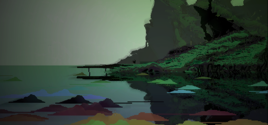 The shot of DEIOS that I cannot remove from my brain is this one. Those green shaded mounds nestled on the edge of a crystal lake, which reflects a half-tone image of the land above, and what looks like small clouds of varied color floating by on the water’s surface, further confusing the separation between sky and lagoon. When I see this image, I also hear the game’s soundtrack: interlacing early computer sounds shimmering into existence, an inward electric snare throbbing with half-effort, while a drony bass noise borrowed from a cyberpunk cityscape imagined circa the synth-heavy 1980s boils underneath.