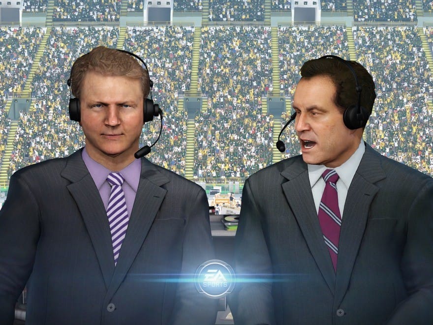 Never interested in skipping through, I play through the first pre-season game, and it’s an excellent, relatively low risk way to get my bearings in the game. The televisual presentation throughout is spectacular, with a brand new opening featuring a very slick animated transition to the establishing shot of the stadium. Phil Sims and Jim Nantz are back, and as creepy as ever, and while the two-shot showing the commentators is a standard trope in sports television broadcasts, I wish Madden would give up until their models look better. There’s obviously a resemblance to the popular football duo, but their digital versions are as cold and dead, their motion as erratic as a Disney World animatronic.