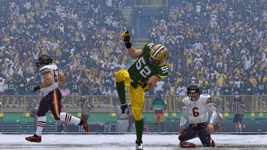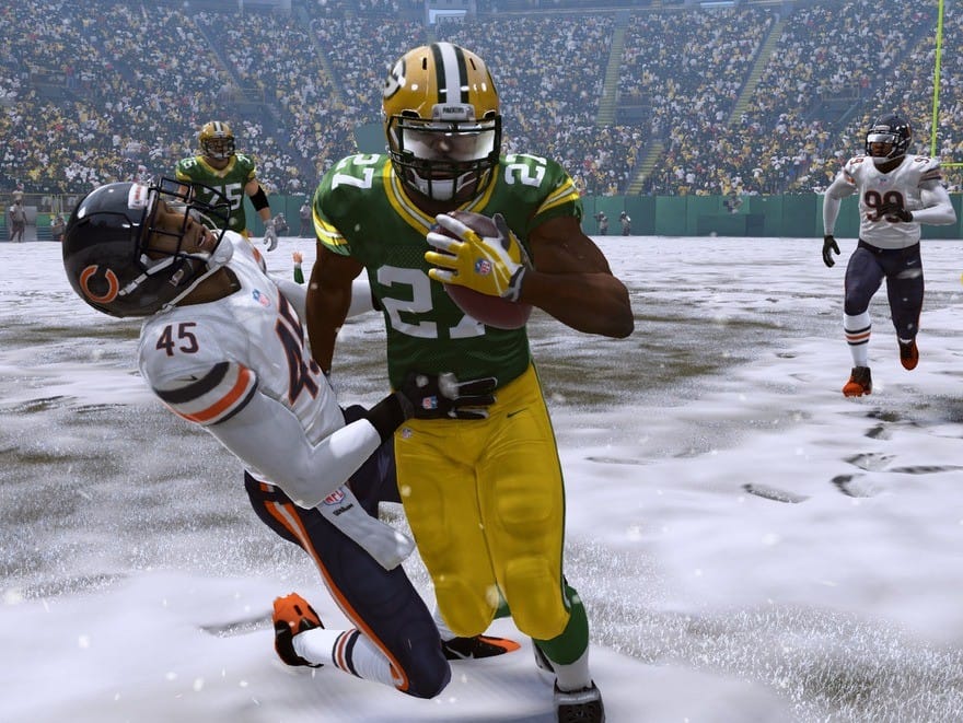 Madden NFL 15 is beautiful and intoxicating. It presents a sanitized version of football that reminds me of what I love about the sport. I love the skill, and the balletic athleticism required to play at the top level. I love the fall weather, and the wide green rectangular field. I love the symphony of football, so present in this year’s videogame, with the oomph of horn fanfare and the thunderous rumble of timpani. I love the dirt, and the way the soiled uniforms tell the story of the game. I love that AC/DC’s “Thunderstuck” plays before kickoffs. I love the oblong ball, and the subsequent odd bounces. I love the sport.