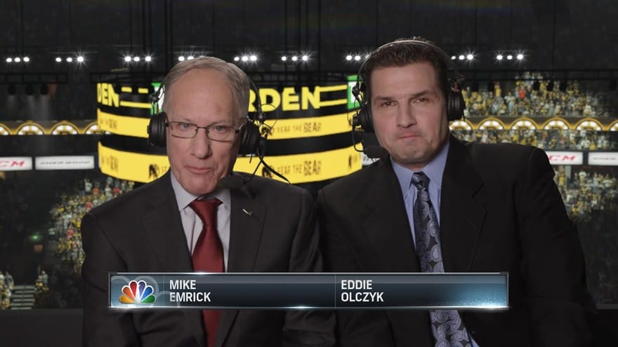 By and large on the ice, NHL 15 continues and improves upon my experiences with last year’s game. The game is beautiful to look at. The introductory sequence and the overall televisual production features branding and interstitials from NBC Sports, who have an extensive deal to broadcast NHL games on television. In addition to this, the sportscasting tandem of Eddie Olczyk and Doc Emrick are included in the game, and not as uncanny valley digital denizens but as full-motion video recordings on top of a digitally modeled arena. I was caught off guard the first time I saw it, but I love it. Maybe it’s because it flashed me back to days of playing FMV games on laserdisc; maybe it’s just so much better compared to the half-dead, cold-fish sportscasters in Madden.