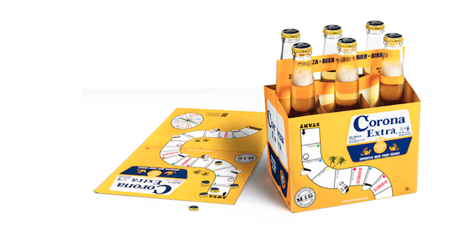 6 beers and a boardgame – yet same weight as before. Simply flatten the box into the game, and use your bottle-caps as the game pieces. Dice and game cards are downloaded to your smartphone via scanning the QR code… Drink, socialize, and have fun.