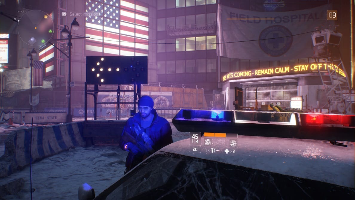 The view outside of Madison Square Gardens is one example of how Ubisoft Massive has repurposed Midtown Manhattan to suit its game’s persistent, near-future crisis state. Fences are lined with razorwire. The digital billboard out front loops between two images: an American flag and the seal of the Catastrophic Emergency Response Agency, the game’s fictionalized version of FEMA. A tarp has been thrown over the sign at the front entrance of the building, rechristening it the Madison Field Hospital. “Remain calm,” a marquee urges. “Stay off the streets. Help is coming.”