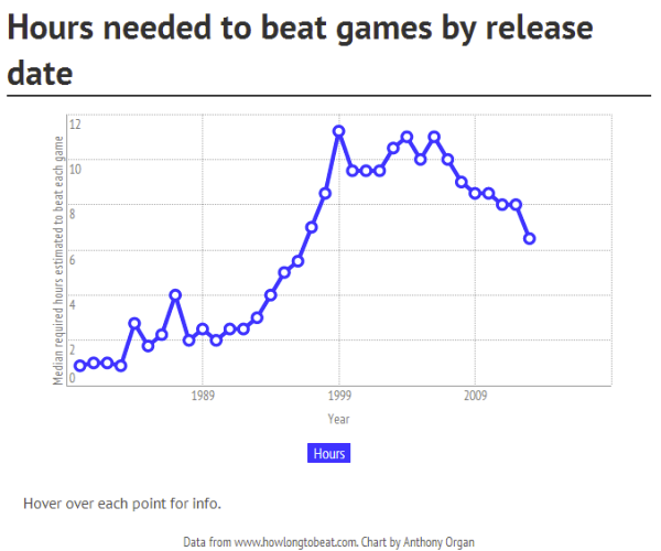 But whether you think similarly, or not so much, the length of games is shrinking, according to this great piece of data-centric research by blogger Anthony Organ. His source seems solid, as Organ mined data from the HowLongToBeat database, a popular site that obviously documents how long it takes to beat games.