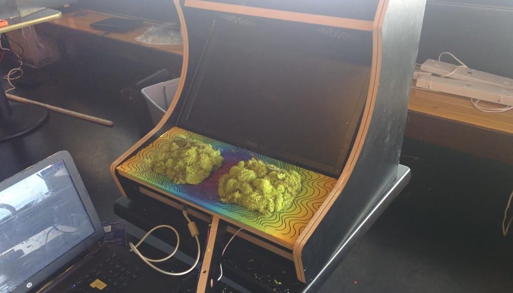 This is really happening. Right now, at Fantastic Arcade, Alea is being played on an arcade cabinet. You have to poke all four fingers on each hand through two of the springy, soft lichens to get at the buttons underneath. You dip into nature first before connecting to the electronic media beneath. What a bizarre and delightful way to play a game. (I bet that moss will get warm, though.) The idea was net artist Cale Bradbury’s, who was inspired by the insectoid typewriters in David Cronenberg’s Naked Lunch.