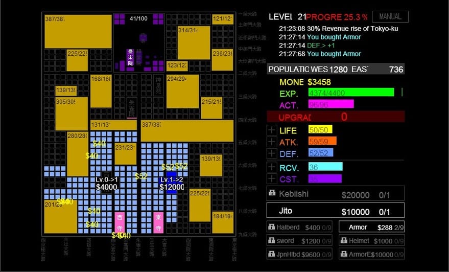 Heiankyo Parameters takes the idea of an RPG, abstracts it into a graphically minimal interface, and gives the player a sense of being a puppetmaster at a switchboard rather than a “hero for the ages.” Parameters improves upon the previous Heiankyo by throwing city building into the mix, but the game’s previous allure—that is, its surprisingly compelling mix of strategy and grinding—remains intact.