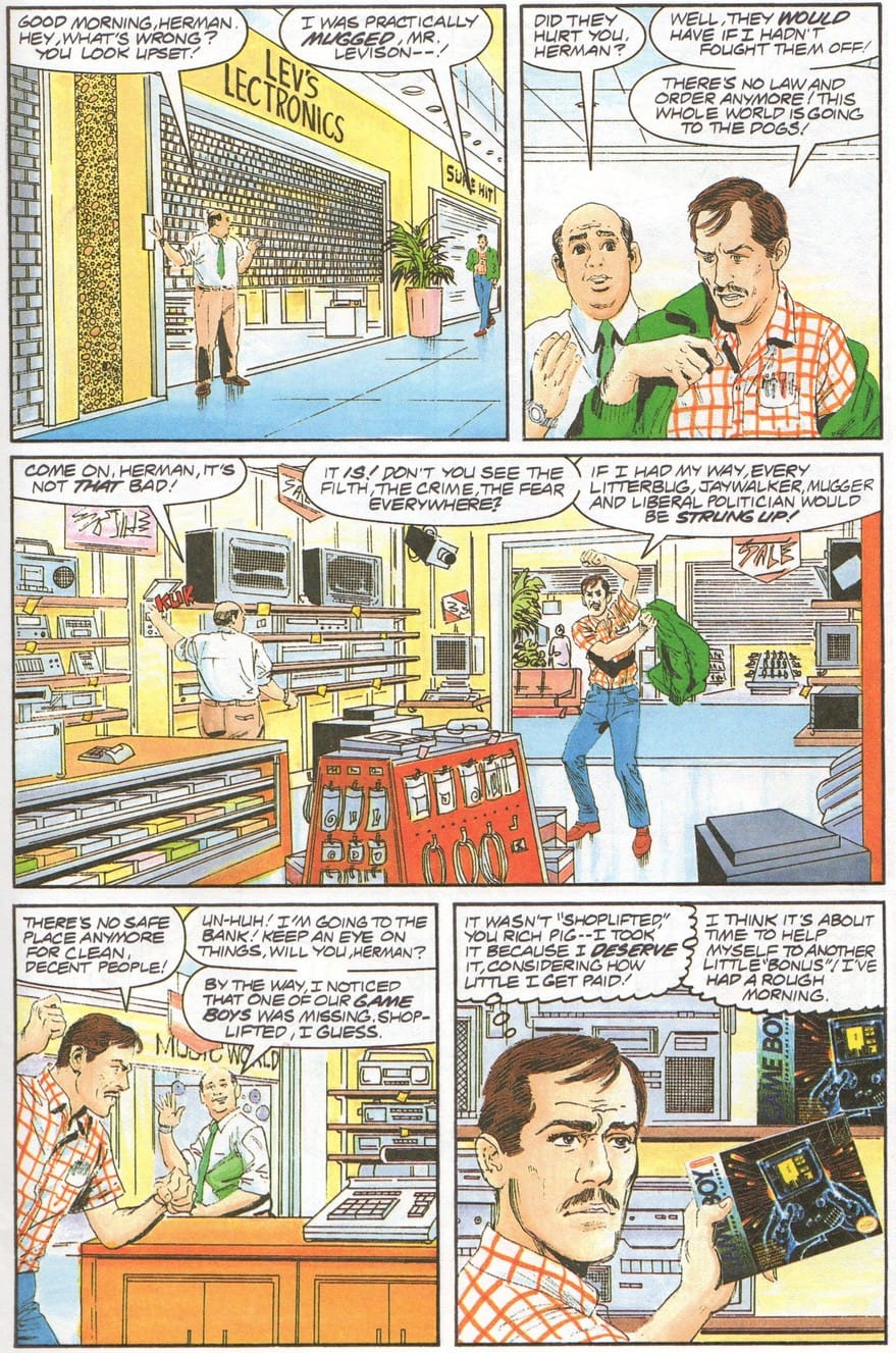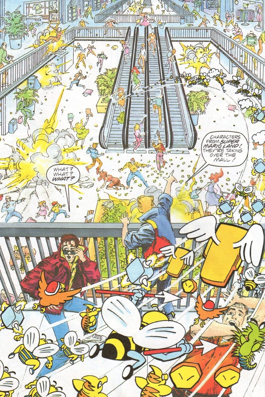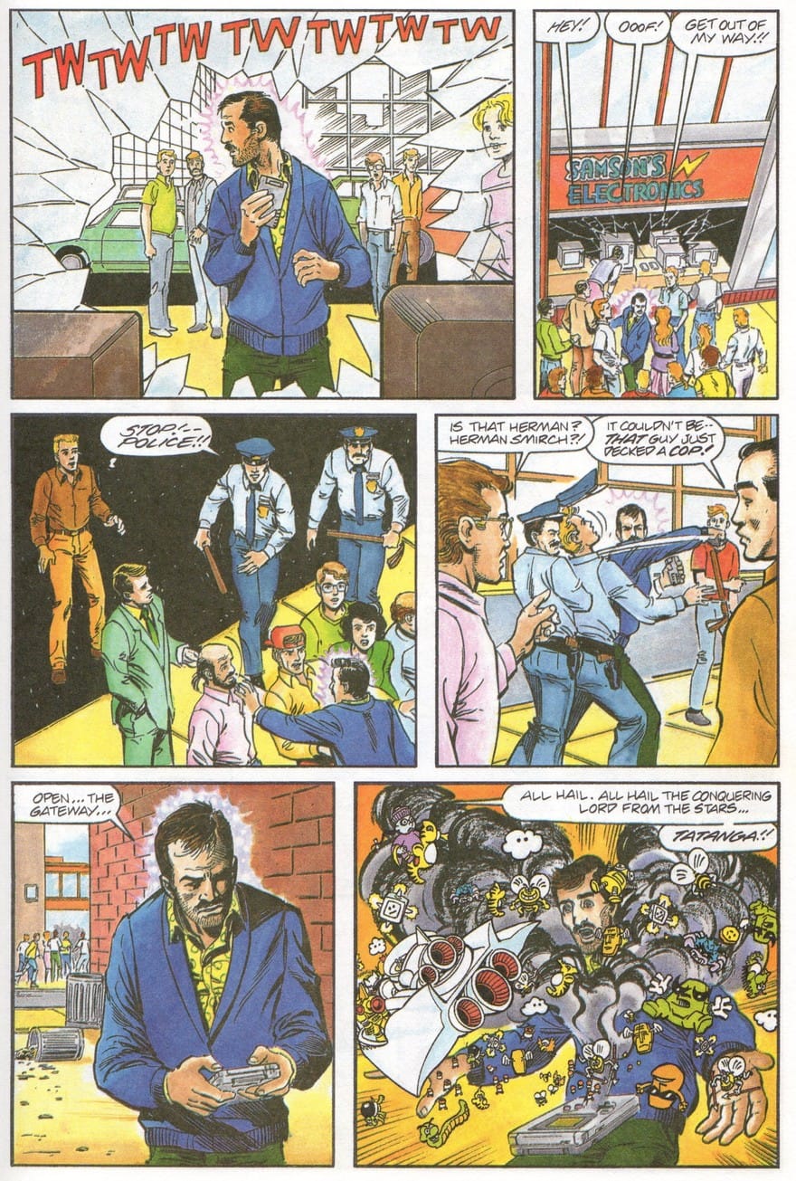 These comics continued for four issues, across which the ill-begotten Herman would summon Tatanga to our world, usually under the influence of a Game Boy. The action contained within would completely abandon the guidelines and restrictions set by most Nintendo standards. Over the course of the comics, Herman would use a brick to shatter the window of an electronics store, openly steal a Game Boy, and assault a police officer who tried to stop him from freeing Tatanga. Via the command of videogame characters, Herman stole a semi-truck, hijacked a plane, and kidnapped a young girl. This was such a contrast to the playful comics and cartoons of the day, where Nintendo properties told humorous stories and encouraged kids to purchase and enjoy their wares. Instead, the readers were presented a tale where Nintendo products were used to influence violent deeds and summon terrible warlords to conquer our homelands.
