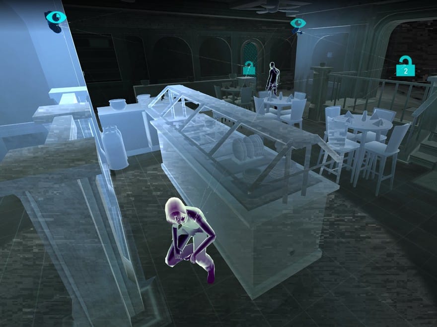 It’s here that the game’s mechanics are enumerated: with the tap of a finger, you jump from the phone to a camera on the wall. République is nothing if not slick—Camouflaj put some serious thought into designing for a mobile platform, and it shows. You, the player, hop from camera to camera, guiding Hope through each stage and helping her avoid guards, the Prizrak. (If you tap on a Prizrak, you’ll see a brief summary of what crimes he’s committed, what items he’s carrying, his nationality, his face—each a Kickstarter backer, a nice nod to the crowd, as well as the culpability of us all.) You can unlock doors, hack email, and disable security systems, but your interventions are limited to the mostly indirect. The game’s AI controls Hope, and though you lead her through the shadowy world of Metamorphosis (the facility’s name), she’s not a puppet. Tap, but don’t touch.