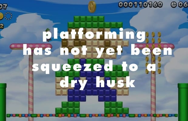 Something happened yesterday that hasn’t happened in twenty years while playing a traditional 2D Mario game. Having one life left, I fell into a pit and died. “Game Over,” my screen said, the chunky font a vibrant green. Game… over? Of course, this phrase is a misnomer by now; I could begin again from where I left off, but with one glaring difference. Before letting me loose into this gauntlet of moving platforms and flying turtles, a menu popped up, showing my Life Counter clicking up from zero to five. By the grace of Tezuka I have been given another chance.