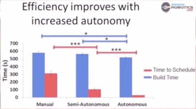 When the robot lead the human team, the time it took to schedule each worker was dramatically reduced compared to when tasks were assigned manually, which took the most amount of scheduling time. Subjects also felt like the robot was intelligent enough to understand them and their goals while working.