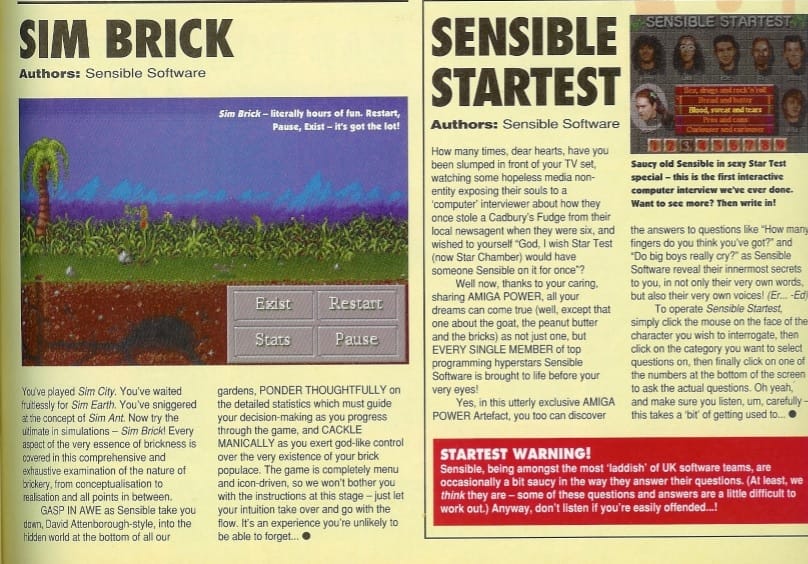 Yes, despite Strange Panther’s claim that Rock Simulator 2014 is the first of its kind, it is far from. Sensible Software’s Sim Brick lets you “exist” as a brick at the bottom of a garden. You can also display some information about the brick, pause the game, and quit—those are its features. Sim Brick came free with Amiga Power issue 13, meaning that one of the magazine’s staff had to write something about it. They placed their tongue firmly into their cheek for the occasion.