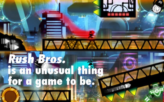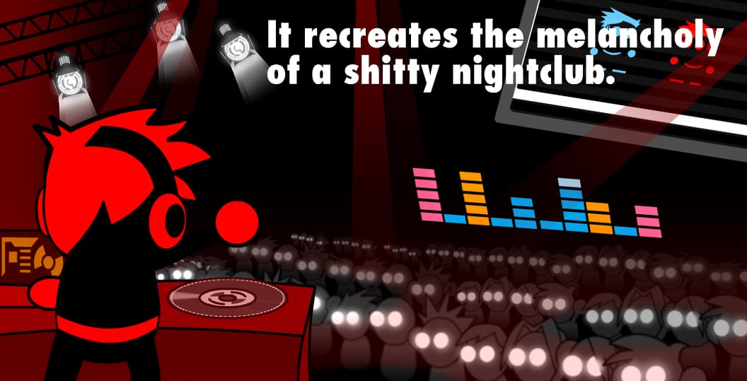 Like Braid, Rush Bros. is a videogame abstraction of a real-life tragedy, but rather than the deep melancholy of a break-up, what it recreates is the deep melancholy of a shitty nightclub. The flashing neon lights, the party music that insists upon fun when no one seems to be having it: these things live in our world behind $10 cover-charges and grenadine-slick doors. As I lurch through these gaudy fantasias, I sense the heat of other humans but can’t quite find anyone; I slide, sluggishly and at intervals, down walls. I slam gin and tonics, attempt to find a beat, and eventually settle into a slouching, dead-eyed leer on a couch. The music, of course, bleats on unaware.