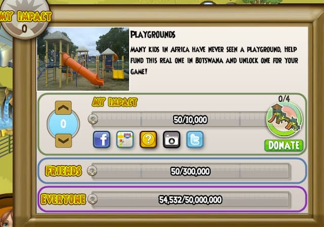Enough with the monkey business! I’m here to help the kids. The Impact button takes me to a menu where I can make a donation that, from the looks of it, will in a million years build a playground for the kids. I put the fifty points I started with into the pool. 54,532 points have been donated in all since the game launched on Tuesday, but the meter has barely budged. This is probably not a good sign.