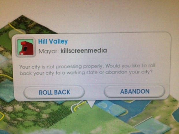 But wait! What’s this? An error message from SimCity’s notorious servers: “Your game is not processing properly. Would you like to roll back your city to a working state or abandon your city?” Lacking both plutonium and a cruising speed of 88 miles per hour, I rolled back my town of Hill Valley all of a few simdays, before I had placed that holosign atop my obnoxious sci-fi casino. And that has made all the difference.