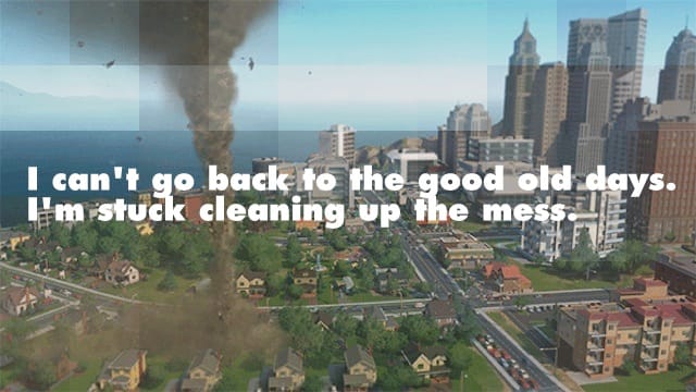 For a game that prides itself on its sandbox appeal, its readiness and openness to experimentation, SimCity‘s extermination of timeline fun cut to the core of my disappointment. I can no longer have any of the fun Bill Murray had in Groundhog Day. If I turned my idyllic town into an anarchic dystopia or unleash one of the game’s trademark disasters, I can’t go back to the good old days. I’m stuck cleaning up the mess. To see joy crumble to misery, watch the Let’s Play series by a charming Aussie YouTube user named ArsenalRobert; he makes it all of 57 seconds into his first video in the series before he says “Let’s try to remain positive, or at least as long as we can” (30 episodes later he says “Hopefully you guys hate the game as as much as me”).