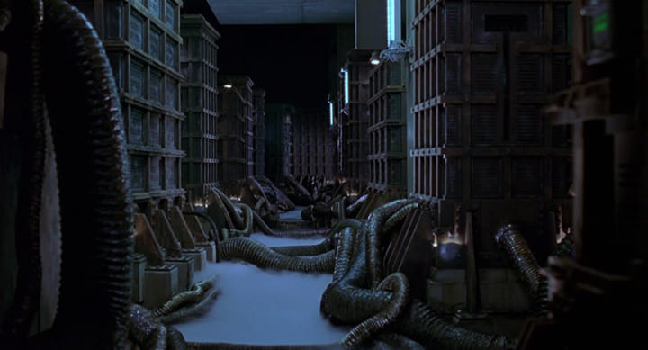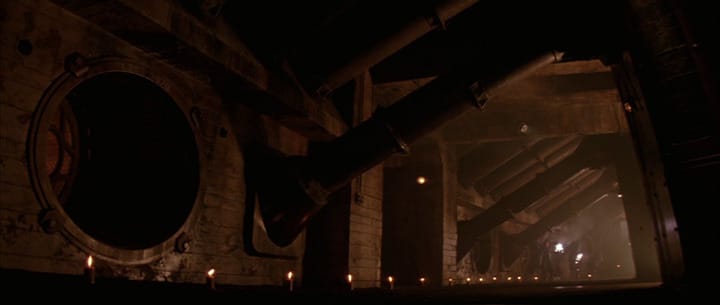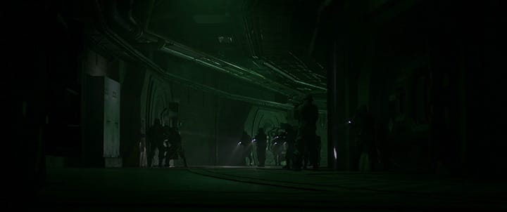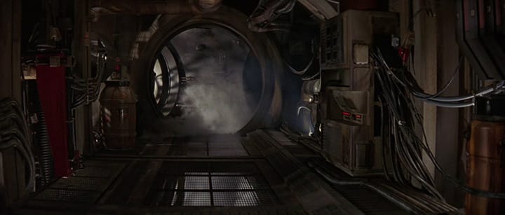 Later on, the same corridors play host to Han Solo and Chewbacca’s escape, forcing them to run and shoot in a half-backwards manner at the pursuing Stormtroopers for the lack of cover. Similarly, in Alien, Ellen Ripley alternately dashes and creeps through the hissing smoke and spinning red alarms of the Nostromo’s corridors as it counts down to self-detonation. These narrow, dark passages are the veins and arteries of this enormous starfreighter, which has become host to a deadly creature. The corridors provide nowhere for Ripley to hide but are the quickest way for her to reach the evacuation shuttle that she has prepared for herself.