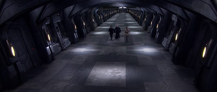 Take the Death Star in Star Wars Episode IV: A New Hope, which is depicted almost entirely as a labyrinth of imposing corridors to be run through. This builds the idea that the space station is a hive of militaristic activity with soldiers constantly striding through to deliver messages to their superiors. Everyone is walking and talking; people in a constant state of transit in front of the camera.