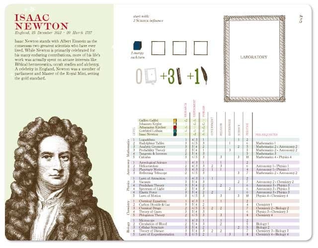The worker-placement board game The New Science lets you play as one of five legendary scientists. Each turn requires dividing three action tokens between research, experimentation, or publishing. Players can learn about scientists’ conflicting motivations, and pretending to be Issac Newton sounds plain fun.