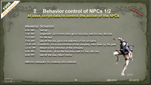 At GDC, Suzuki talked about the need to control NPC behavior so the city felt alive. Behind him, a slide explains that “AI uses script data to control the action of the NPCs.” It reads like something straight out of “Fitter Happier.”