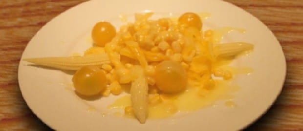 That is, if the food doesn’t. This appears to be a plate of baby corn, corn kernels, and un-ripened cherry tomatoes splashed with stomach bile.