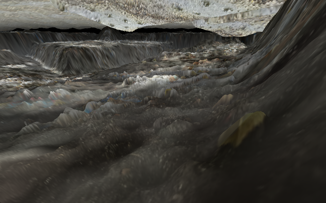 To look at MacLarty’s virtual world without context you’d see only a jagged, garish blend of gullies and mountains that stretch on forever. There’s also a ceiling that clashes with the terrain below it either in its hue or by physically colliding through it. There’s a sense of discordance throughout that, through its fragmentation, seems to represent the turmoil of MacLarty’s introspection at the time.