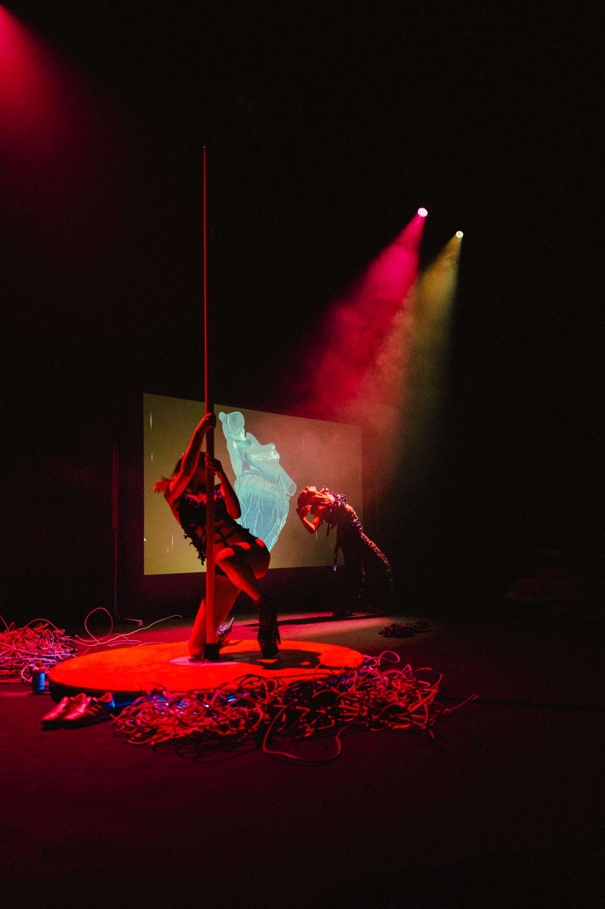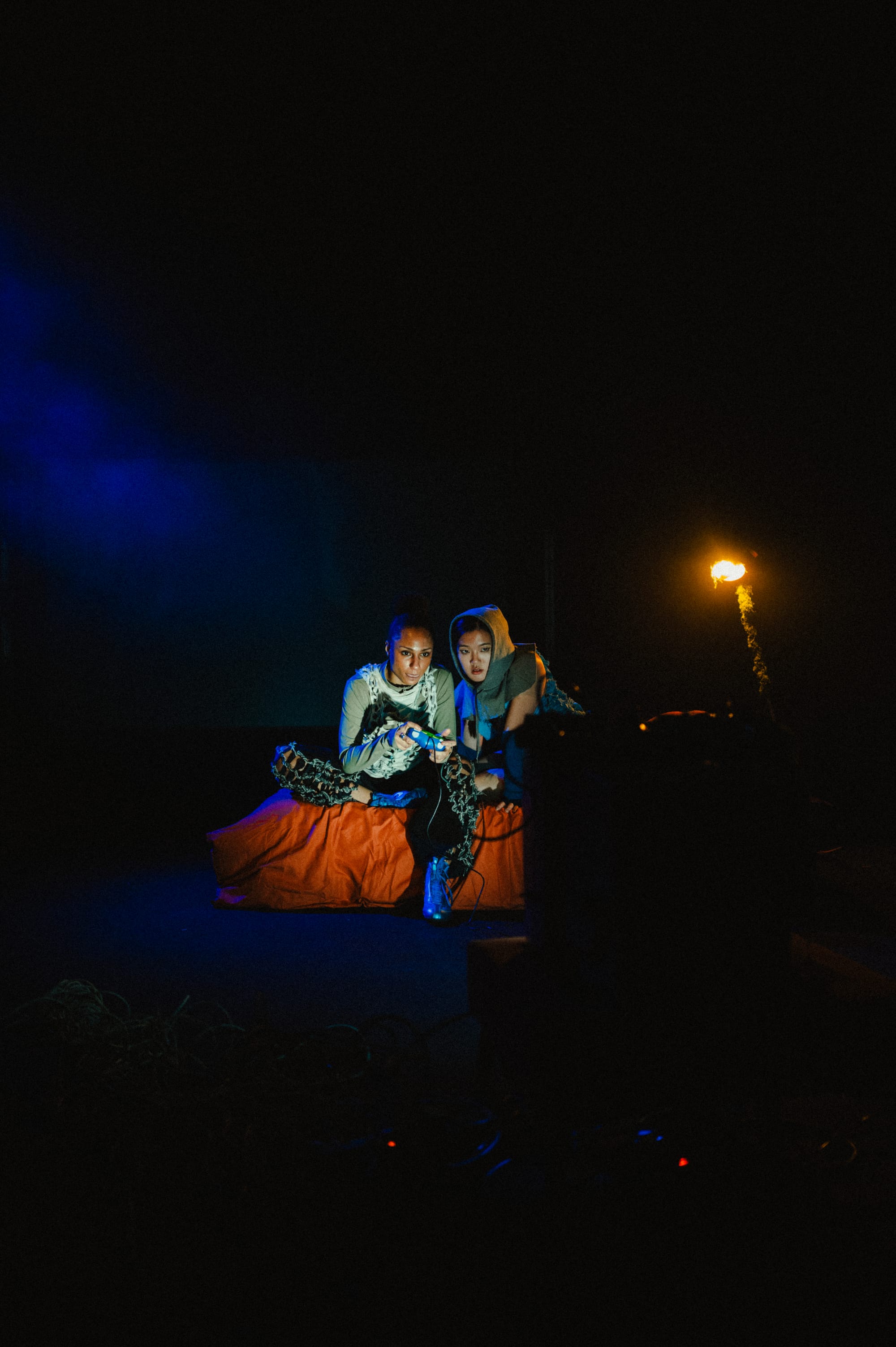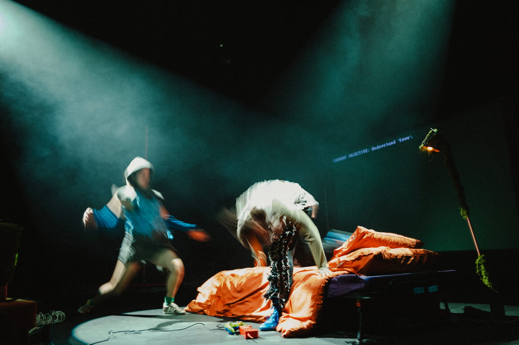 The London- and Kent-based interdisciplinary artist has spent the last decade building a practice that fuses circus, cabaret, pole dance and roller skating with experimental game design. Her most ambitious project to date, Nullspace Motel, is a 40-minute live art production that places audience members in an orange lounge chair, controller in hand, while two dancers—a pole dancer and a contemporary dancer playing lovers named Dusky and Hayden—perform a fractured love story onstage. The choices players make in three philosophical mini-games ripple into the narrative unfolding in front of them. "The design wasn't so much winning or losing," Symoné told me, "but it's the shaping of a narrative that is affecting the story."