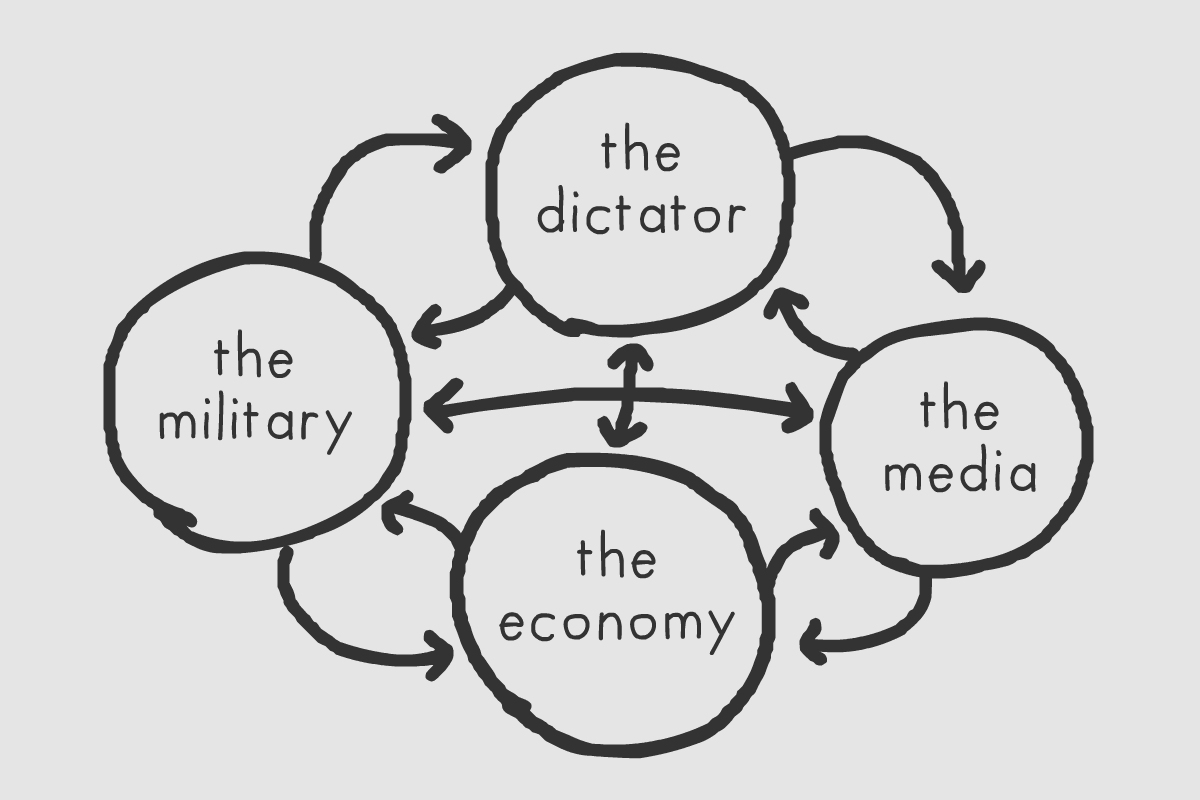 This is because political power isn’t linear. It may seem like the guy on top controls the guys below him who control all of us, but Case explains (with a great, loopy illustration) that it’s more complicated than that. The head honcho and all of his cronies, along with the systems they represent, act more like checks and balances to each other. For example, a President Trump would be checked by opposition in Congress, the realities of our military capacity, the fact that everyone hates him, and Mexico, who aren’t going to build his stupid wall. The revolution that he promises his supporters may still come—who knows what that guy could do—but it’s more likely that he’d be halted halfway there and the US would be thrown into political turmoil, as has happened to many a revolution before him.