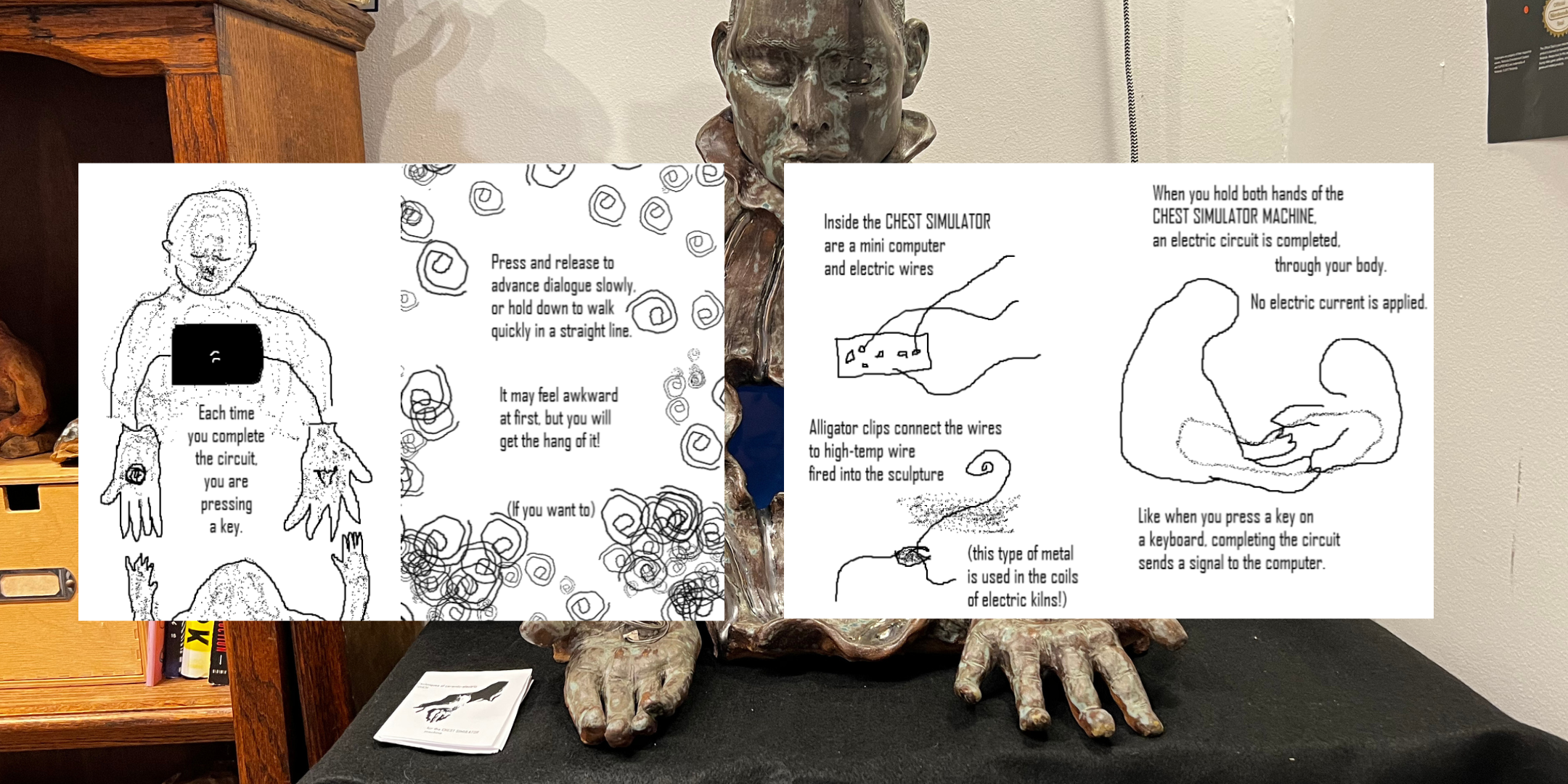 The context is what makes the Chest Simulator so different. First, you are holding hands, mapping your movements over the sculpture’s copper wiring to advance each page. Consider whose hands you hold–a parent, a partner, a child. Perhaps you say a prayer at dinner with others. But in general, the act of hand-holding is a rare gift. Games have attempted to simulate the intimacy (notably 2001’s Ico), but it’s quite different when you can fill the contours of a hand rising to meet yours, even if they are cast bronze.