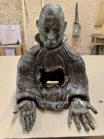 The sculpture is much smaller than me, my hands eclipse its own, and its lips and mouth closed in meditative contemplation. A shawl collar erupts over the neck, and cybernetic pathways descend over the shoulders. A black and white screen has been placed in the center of a gaping cavity bordered by the clay’s edges, ruffled as if torn. Something escaped, or perhaps something had been removed.