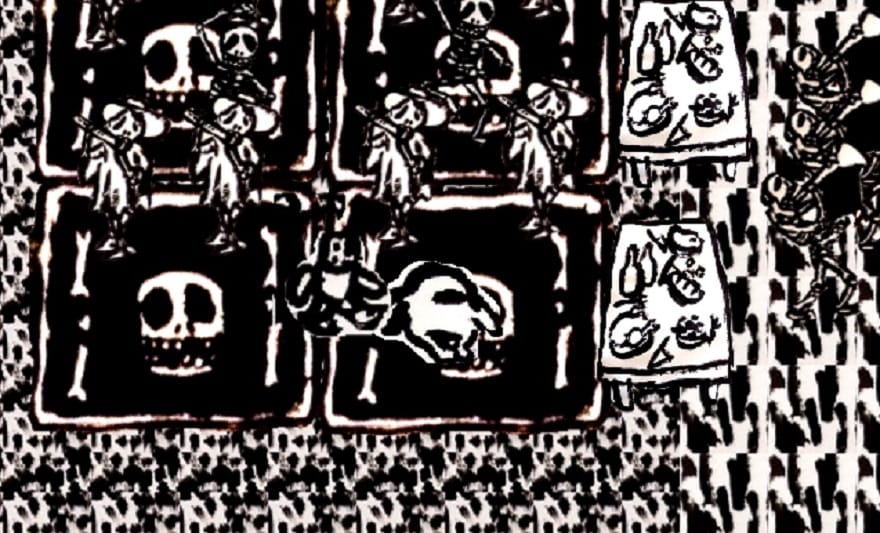 The Kingdom of Death is a surprisingly animated place. Skeletons dance and blow on royal trumpets as banners sporting skulls flap in the breeze. There are banqueting halls of meat and mead and jesters that fling their bones about with glee. You guide Meepo and Drizzly through this delightful necropolis as they step to the cheery noodling of a guitar.