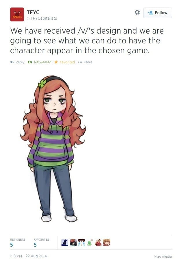 Perhaps one of the weirdest events of “gamergate,” and one with interesting connections to In Real Life, is the creation of the bizarre anti-feminist icon “Vivian James.” A red-haired, hoody-wearing, “gamer-girl,” Vivian James was designed collectively by members of 4chan’s /v/ board. This strange turn of events came from a misguided attempt by the board to clear its infamously misogynist reputation by supporting the Fine Young Capitalists’ female-created videogames project. As part of this support the board designed “Vivian,” “a typical gamer girl.” With her dour scowl, she represents an image presented by aggressive anti-feminists as an attempt to placate those seeking better representation of women in games.