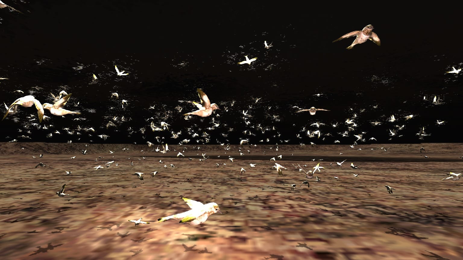 When I ventured inside this 3D world the vast aloneness of the space was immediate. With my first few steps I saw bombed out buildings made of dry rock, a lone monolith staring out the sun, and a spinning tunnel of ooze-flesh in the middle of nowhere. What struck me most, however, was a large inverted silver pyramid hanging over a lake (the same pyramid on the album’s cover art, I learned afterwards). Entering the lake, the water’s shimmering surface turned inside out to become a liquid black ceiling. Ahead of me were what seemed to be the glimmering scales of fish, but upon closer inspection were revealed to instead be a huge flock of tiny birds flapping in the water. The music shuddered as I watched them glide and suddenly this calm scene overwhelmed me with what was obviously terror. It was as if the mesmerizing sight of these birds was a siren’s song, causing me to forget that I needed to breathe, with the music’s aggressive turn snapping me out of the lull to have me realize that I was drowning.