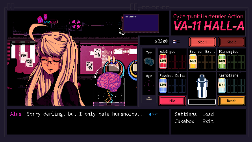 But robot sex workers with feisty personalities aren’t the only thing setting VA-11 HA-LL-A apart from other cyberpunk imaginings of the future. As developers hailing from Venezuala, Christopher explains that their vision of a bar scene in the midst of dystopia “is based in our experience of living in a third world country, where it’s natural to look for a place where you can be happy without the constant bad news.” With the country’s constant food shortages and seemingly permanent financial crisis, Christopher knew what it felt like to experience “a really depressing society, where everyone’s always sad and worried about their future in a country with no hope of recovering. So we came up with a set of characters who, in the middle of this disaster, try to go on with their lives and be as happy as they can with what they have.”