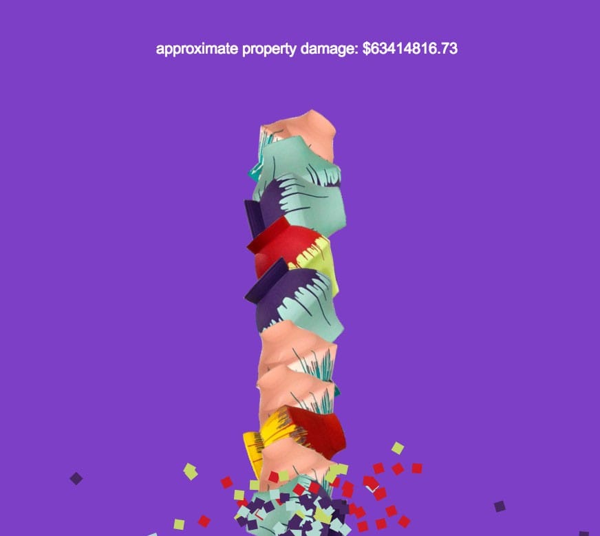 The first time I played, I swooped the urn around the void for probably thirty seconds, testing for any other wrinkles that might reveal themselves before I caved to the obvious. None did. So I clicked my track pad, and the urn I’d been controlling immediately dropped into a gentle but irreversible free fall, at about the same casual velocity as an oxygen-filled balloon. Another urn in a different colorway immediately took its place as my cursor. When the plummeting sculpture reached the bottom of the browser window a beat later, a musical shatter sounded out; the urn exploded into a shower of colored pixels; and a nearly million-dollar figure replaced the triple zeros in the “property damage” header. The game was on.