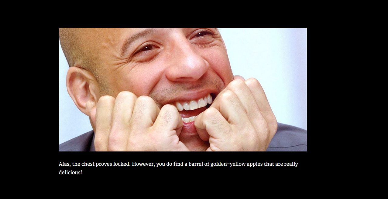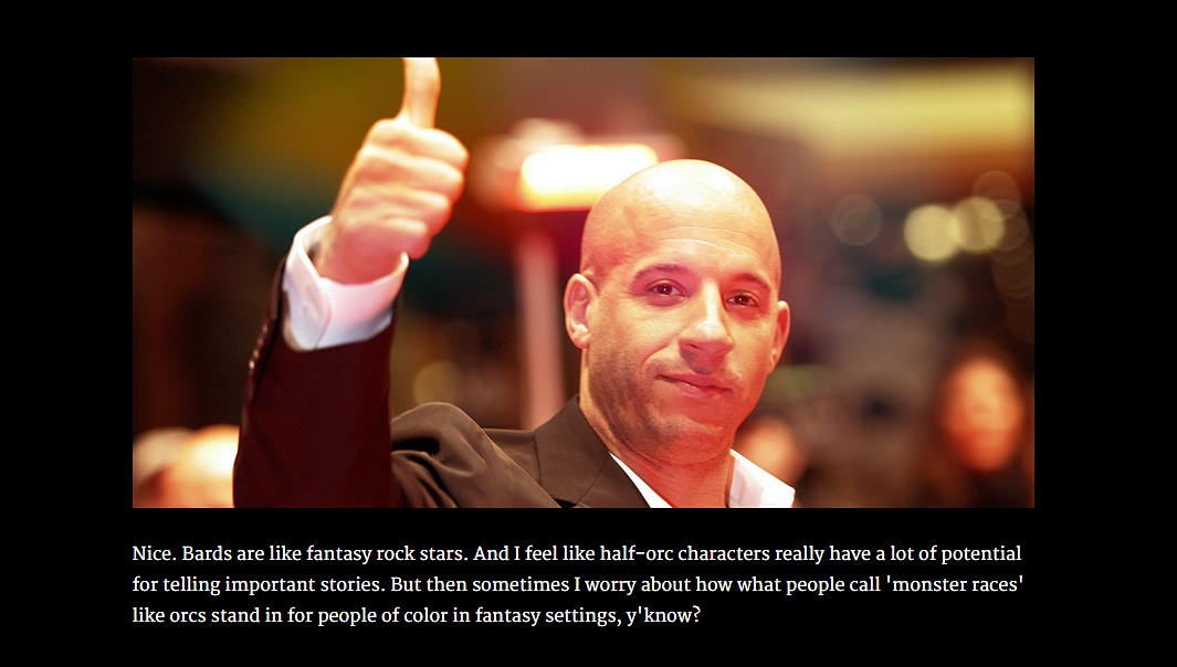 Action star Vin Diesel is one of Dungeons & Dragons’ most eager and vocal advocates. He’s talked about the years he has spent playing the tabletop RPG in many interviews with an endearing frankness. As a stretch goal for funding her new book, Videogame for Humans, game developer Merritt Kopas grabbed onto Diesel’s famous nerdy predilection to create Vin Diesel DMing a Game of D&D Just For You. The game is a text adventure in which the xXx star guides you through an encounter in the woods. Like the man who starred through three Chronicles of Riddick movies, this game approaches D&D from a place of reverence, creating a surprisingly earnest exercise in affirmation.