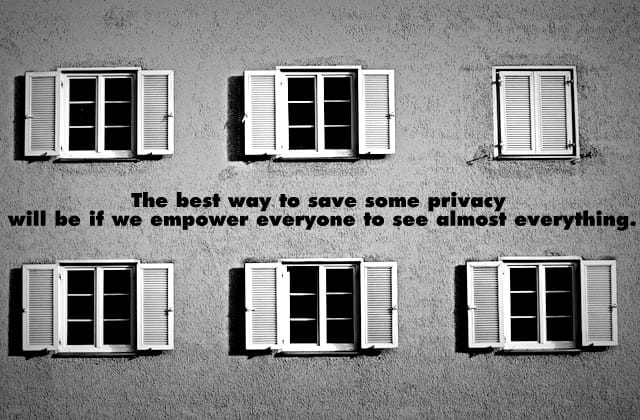 “I consider privacy to be an essential human desideratum, though we will have to redefine it,” he tells me. “And the best way to save some privacy will be if we empower everyone to see almost everything.” This also applies to shady dealings like data collection, at least in theory. While the internet enables the N.S.A. to snoop, it also allows whistleblowers like Edward Snowden to use that same technology to achieve transparency. It’s a two-way street.