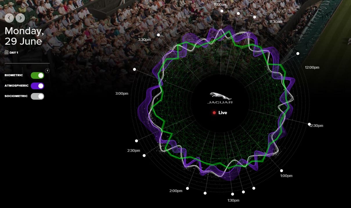 Finally the grey (or white?) line measures “Sociometric” data as it comes in. You’ve probably worked this one out. It’s measuring the volume of mentions that the championships are getting across social media (Twitter, Facebook, Instagram). So if you’re hashtagging your tennis hype then you’re contributing to the data machine. You animal.