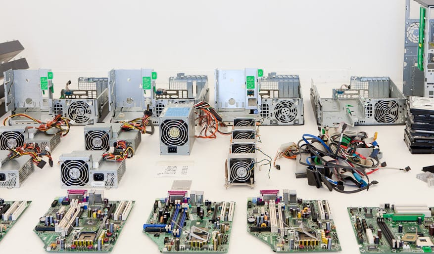 Throw gold, copper, tantalum, and aluminum into a furnace, and what comes out? Usually, microstrip circuits or an ultra-durable capacitor. But in H / AlCuTaAu, the newest work from London-based artists Revital Cohen and Tuur Van Balen, you get the pure elements, nothing more. H / AlCuTaAu was constructed from leftover hardware and tools from a bankrupt factory in the Netherlands. Cohen and Van Balen bought computers, remotes, and transistors as the factory liquidated. Using welders’ tools and seven different acids, they transformed the abandoned refuse into a binding of four pure elements.