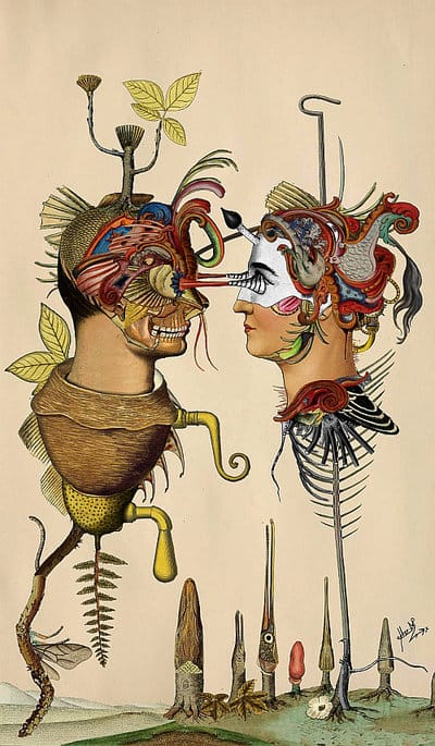 In his 2011 “Collagist Manifesto,” Clowder referred to collage artists as scavengers, as they prise the completed works of others—”obsolete adverts, morbid medical texts, bone atlases, and zoographic curios”—from their creator’s grip in order to remix them into new sights and sounds with their meat-ripping claws. Collage is a technique that finds a metaphorical and physical commonality with the assorted dead skin and stolen organs of Frankenstein’s exquisite monster. “Consequently, bone and exposed flesh are kindred to collage artists as they are our familiar inheritance, and it is mostly from these elements that I composed my creations,” writes Clowder.