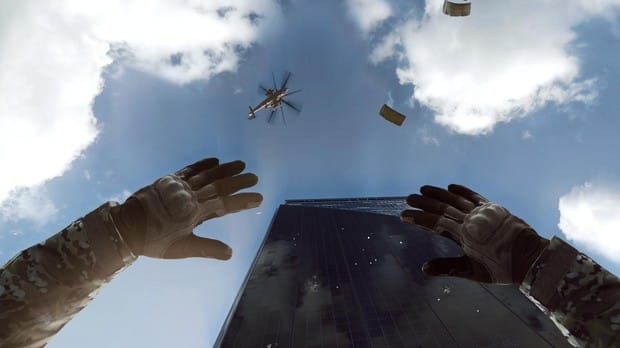 Loose ceiling tiles flap overhead as I chase a Chinese soldier, who jumps straight out one of the holes that used to be windows; I follow, sputtering bullets at his parachute as we sail over the war, drifting down toward control point D, which is a little mall with escalators and a clothing store and a car dealership inside, which have all by now been shelled and machine gunned and burned, just like every object in the world of Battlefield, which no sane person would bring an artificially-inseminated embryo into.