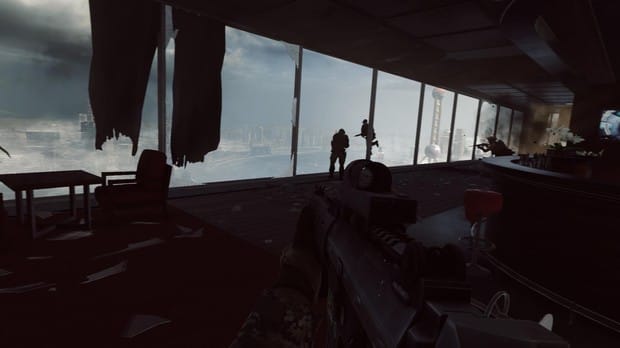 Each control point in Siege of Shanghai—the only map currently available in the Battlefield 4 beta—is a meticulously dressed set. Shooting at a soldier in front of the restaurant or skyscraper bar throws light into a deep background of shattering bottles, flower pots, and tumbling paintings. Other touches sow visual confusion, like the mannequins in Finn’s sportswear outlets (as common as Starbucks in BF4’s Shanghai), or the red curtains that trail out of the windows of the skyscraper and turn like shifting snipers.