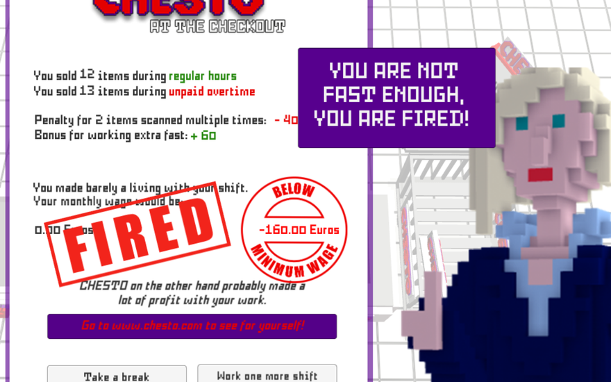 At the end of each day, you’re given a report of your measly earning which is always “just barely a living.” Unless, that is, you’re fired altogether for “costing the company too much money.” Meanwhile, Chesto boasts the amount it made off of your hard day’s work by directing you to the corporation’s website. They’re nice enough to demonstrate clearly just how much you’re helping their numbers soar, implicating you in their capitalist super villainary. But, Chesto’s website assures, this is a company who “can always be trusted to do the right thing” and only “employs the best people, develops their competence, provides opportunity and inspires them to live our values.”