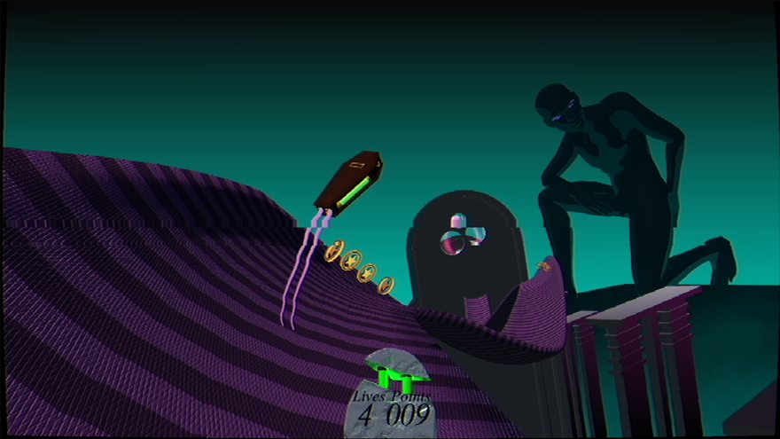 In the underworld, you ride all the way from “Purgatory Etc” to “Millennial Road” and, at the end of every race, you must aim your bobsledding coffin directly in a floating cellphone screen in order to pass on to the next stage. If you miss the screen by even an inch, it’s death—your bones scattered across the pavement once again. Each world’s aesthetic becomes increasingly hellish, too, with the finale featuring a massive figure one can only assume is “the Baroness” that the game description mentions. Will she “take pity on your lonely no-followers having soul, or will she grind your bones into dust?” the Arcane Kids ask. “Is there a difference? Is there such a thing as relief?”